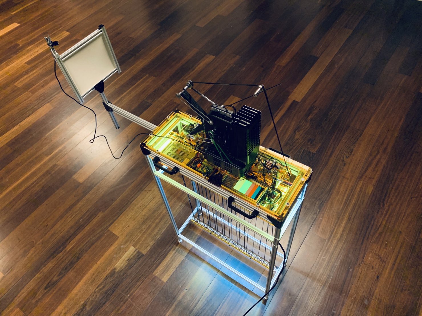 As the visitors surround the installation, sensors analyze their gestures and their movements, when they detect that a picture or a movie of the device is being recorded, an abrasive mechanism is activated and the physical support of the imagery starts to slowly being deteriorated.