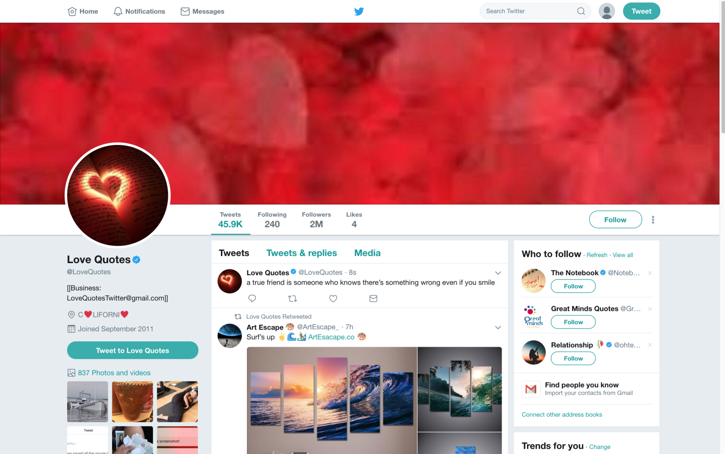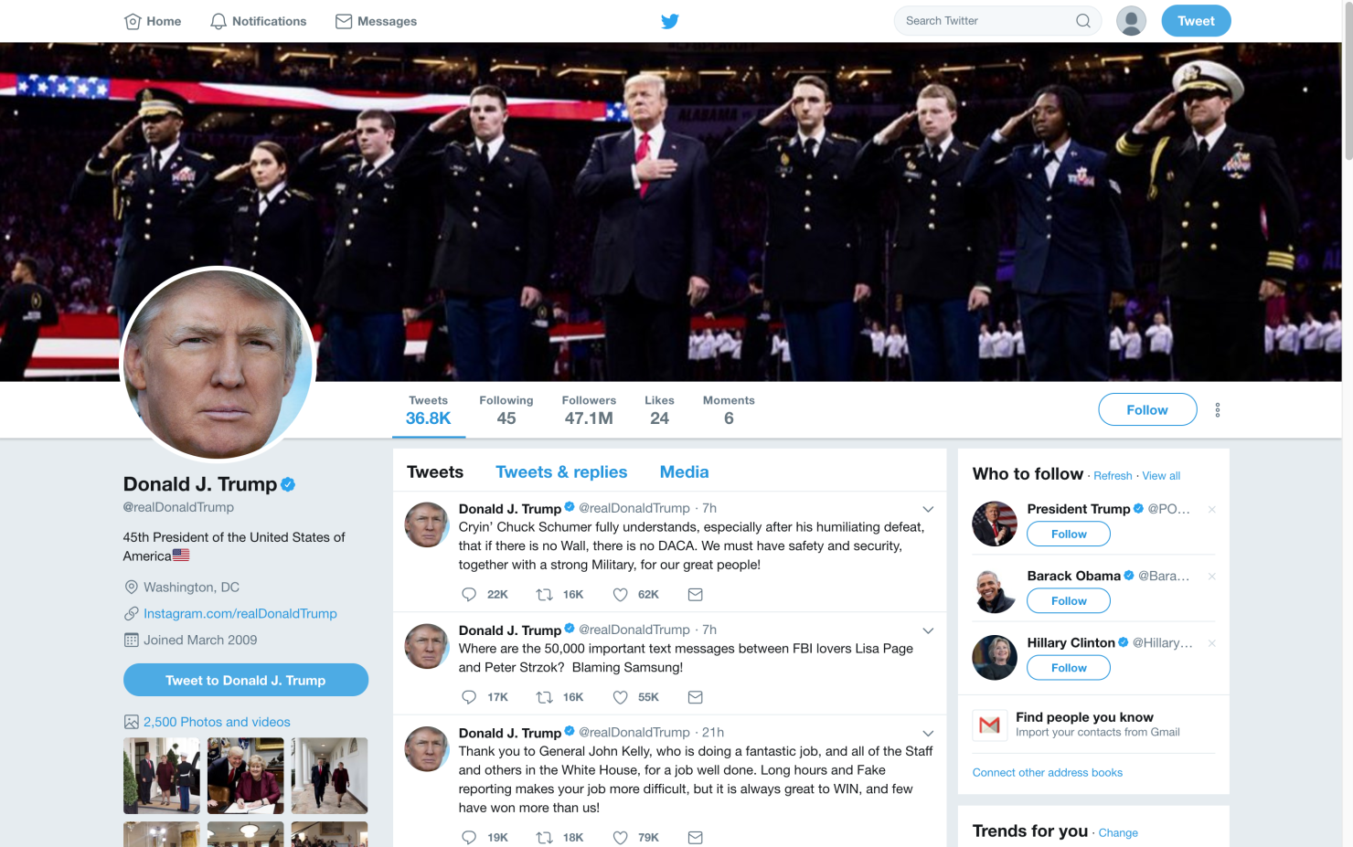 A connected computer, records all the tweets written by the current President of the United States on one hand and by a "Love Quotes" tweeter account on the other hand.