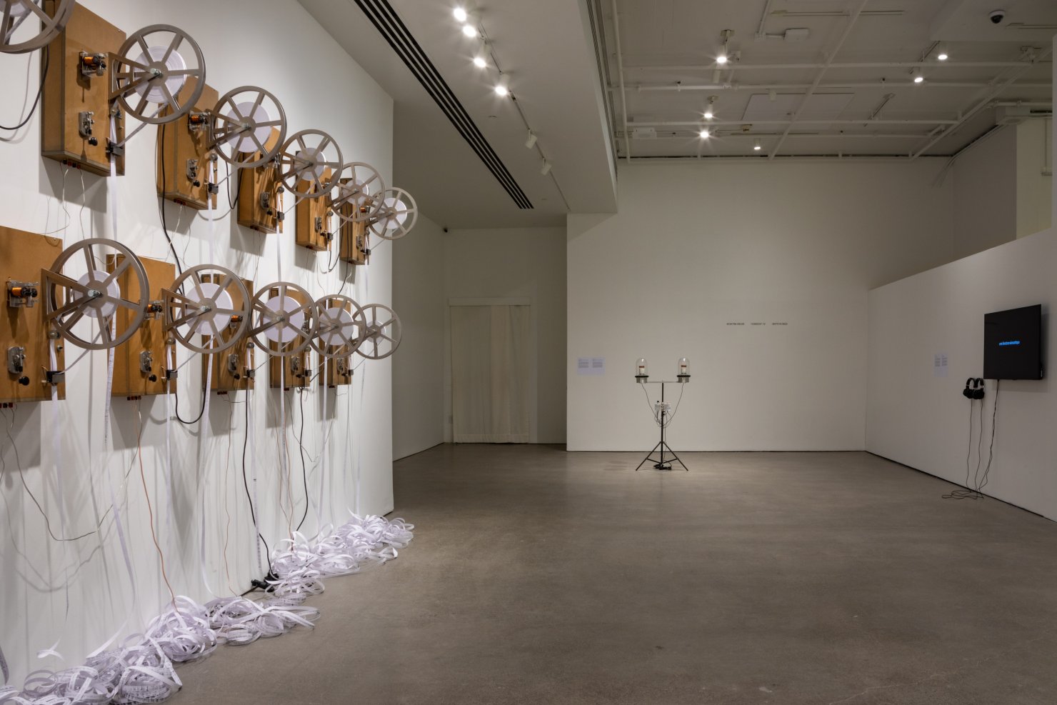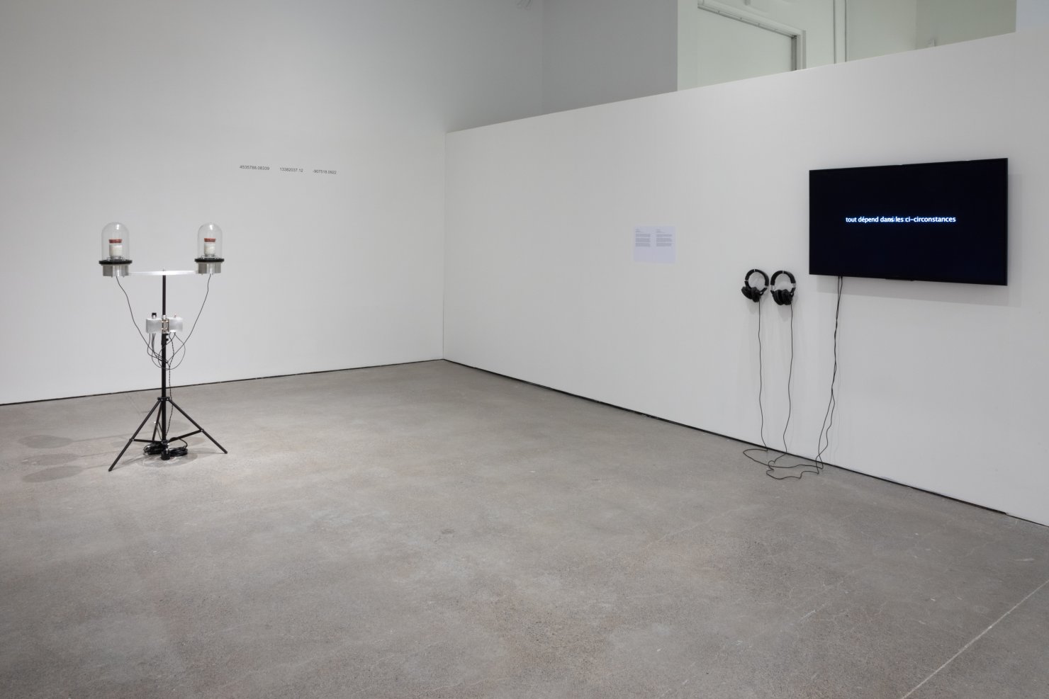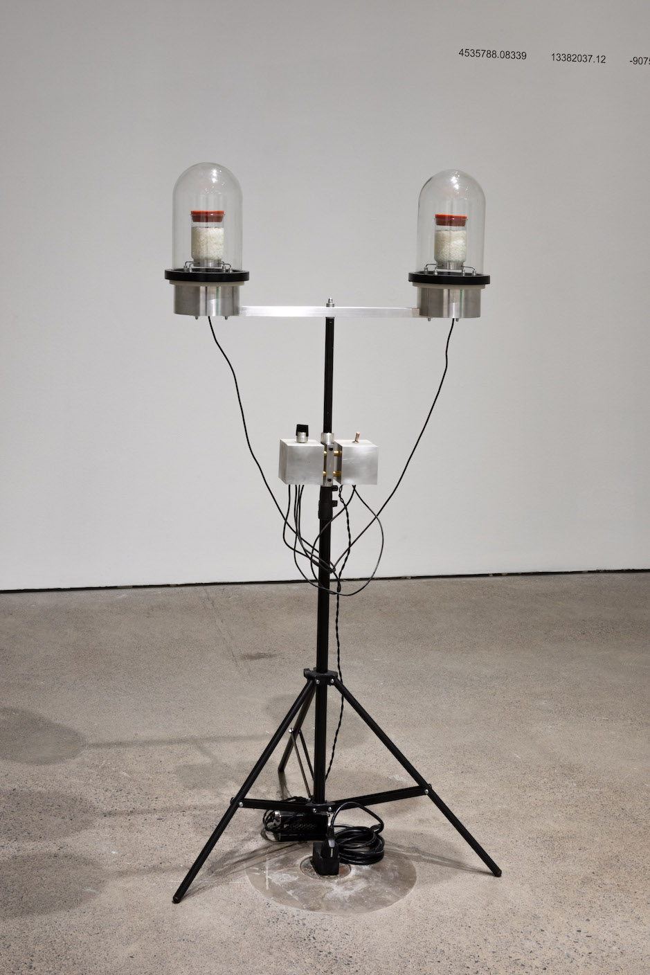 Mixed media : Speakers, Raspberry pi and electronics, glass domes, two beakers with cooked rice, aluminum structure.