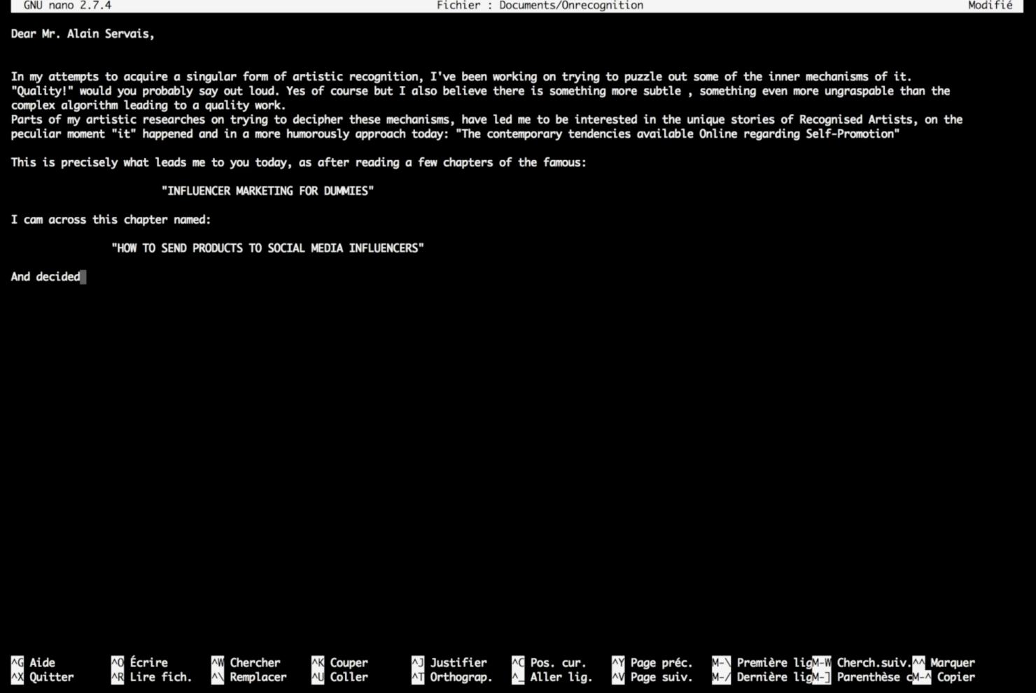 The Video illustrates the writing process of a letter I wrote to a Belgian Art Collector during Art Brussels 2018.