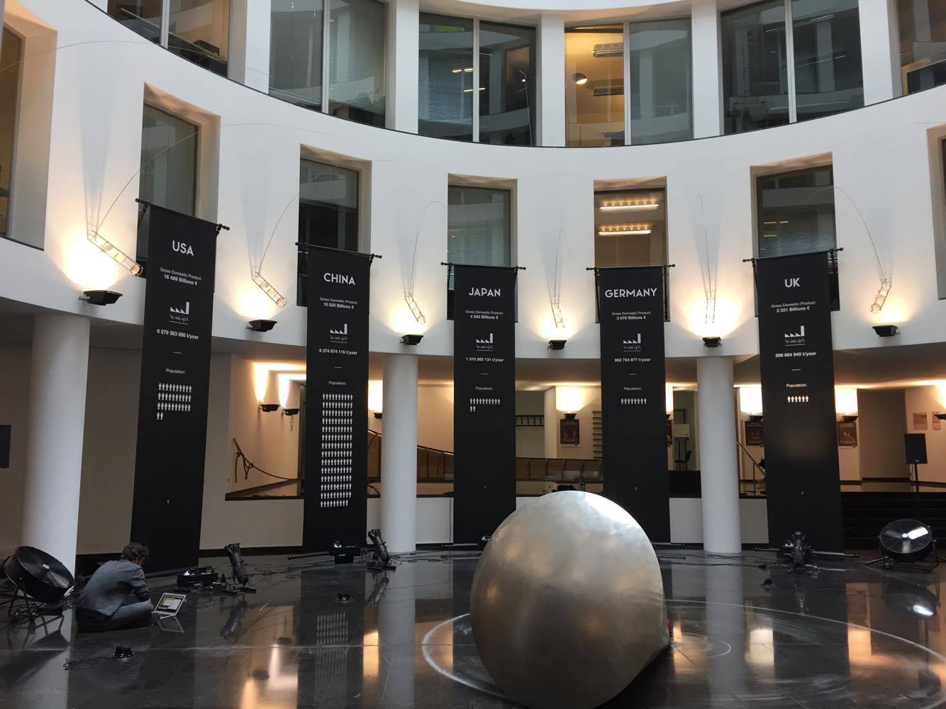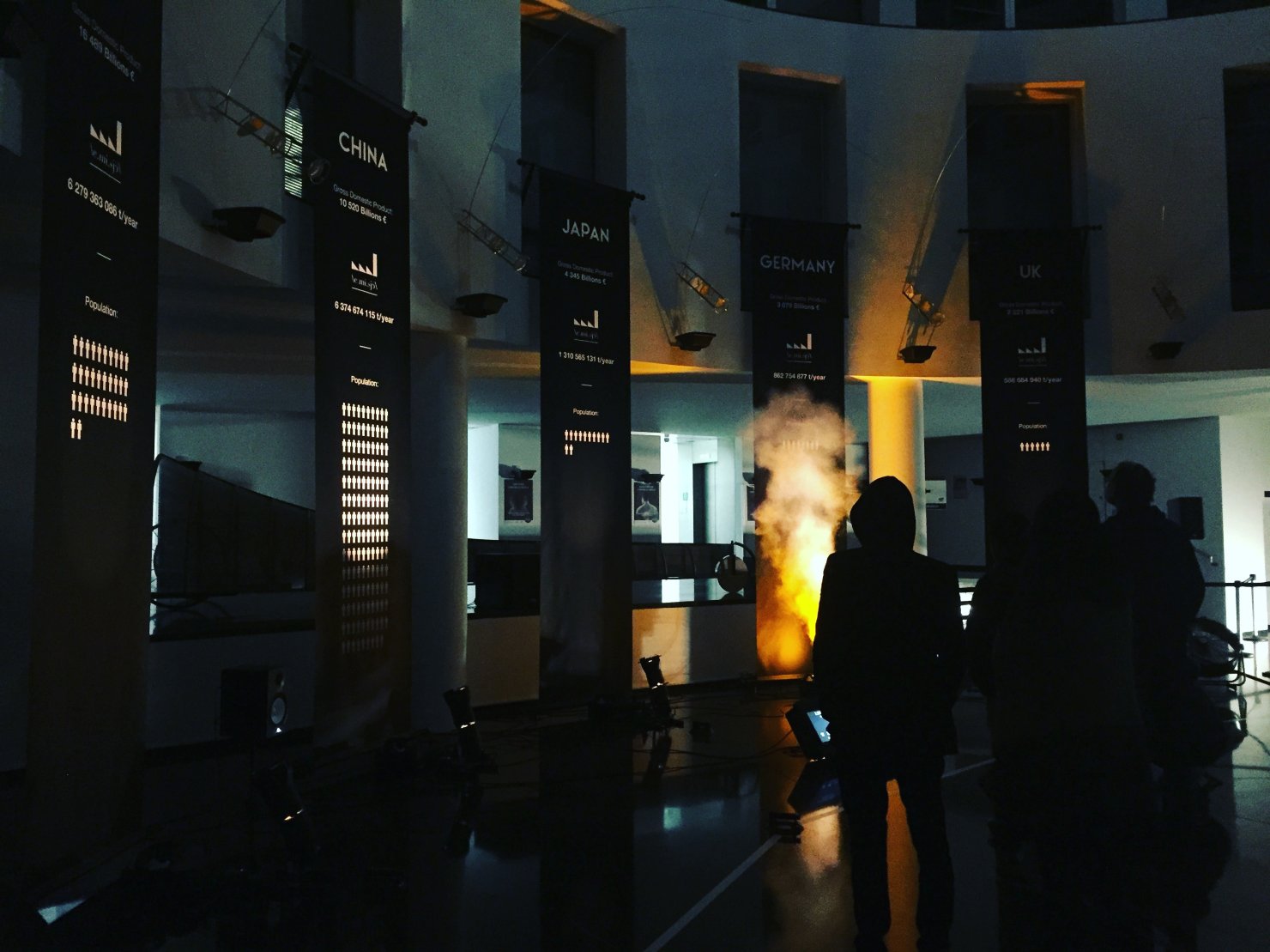Five smoke machines are arranged side by side, each corresponding to a Nation. Under each of the diffuser lies a banner on which the data corresponding to the GDP and the CO2 emissions of the country is written.